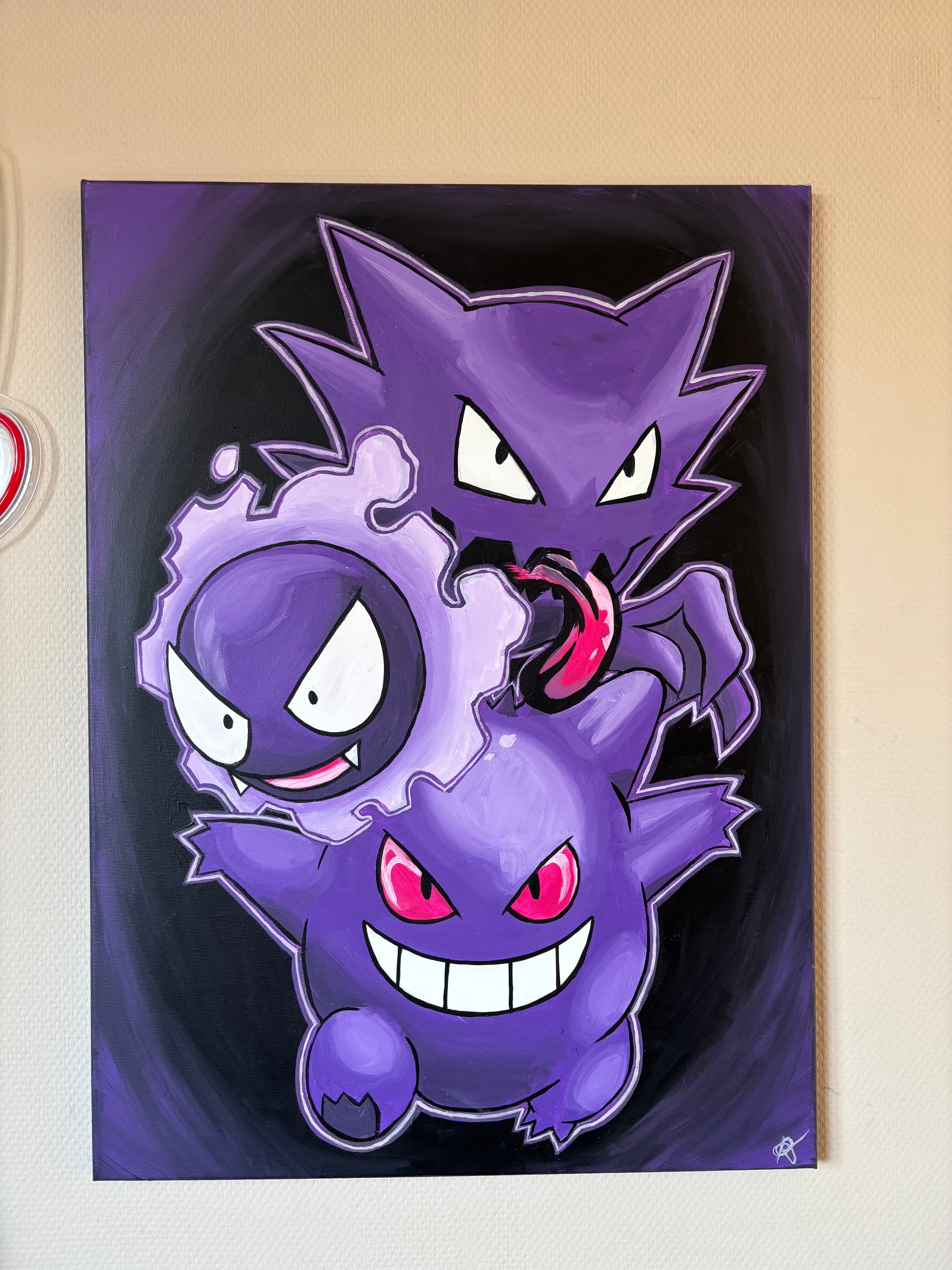 Dit schilderij brengt Gengar, Haunter en Gastly samen in een mysterieuze en speelse compositie, waarin hun spookachtige energie centraal staat. De drie Pokémon lijken uit de schaduw naar voren te komen, waardoor het werk een levendig en dynamisch gevoel krijgt.
